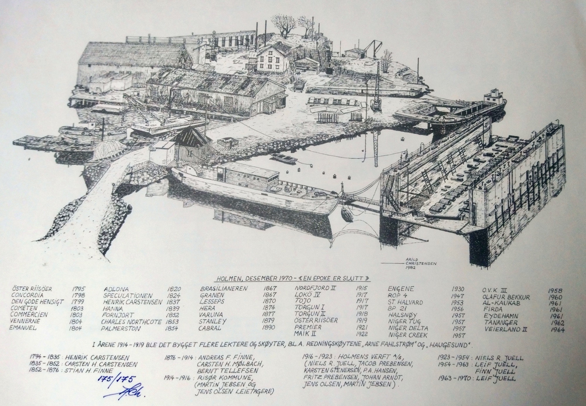 Tegningen av Arild Christensen forteller hvilke skip og skuter som ble bygget på verftet, samt hvilke eiere som preget perioden 1795-1970. Etter den tid overtok Wisbech-Refsum fra Drammens driften og den gamle bygningsmassen måtte vie plass for nye og mer moderne bygg. I 1988 etablerer Lindstøl skips- og båtbyggeri seg på Holmen, et verft med tradisjoner tilbake til 1870. Denne virksomheten holdt det gående frem til 2003.